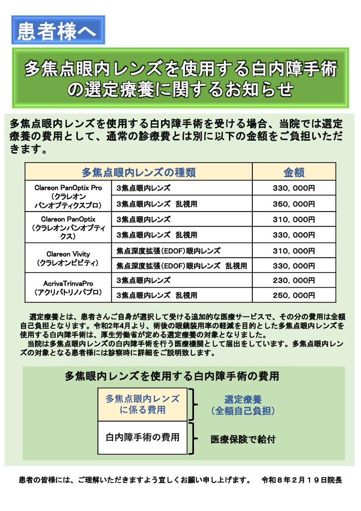 選定療養(多焦点眼内レンズ)に関するお知らせ(レンズラインナップ・費用表更新)